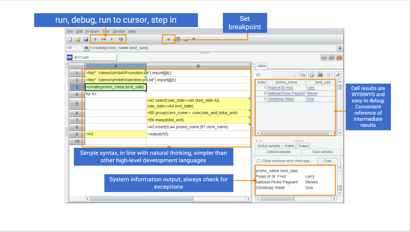 Besides concise syntax, SPL also has a comprehensive development environment offering debugging functionalities, such as “Step over” and “Set breakpoint”, and very debugging-friendly WYSIWYG result viewing panel that lets users check result for each step in real time.