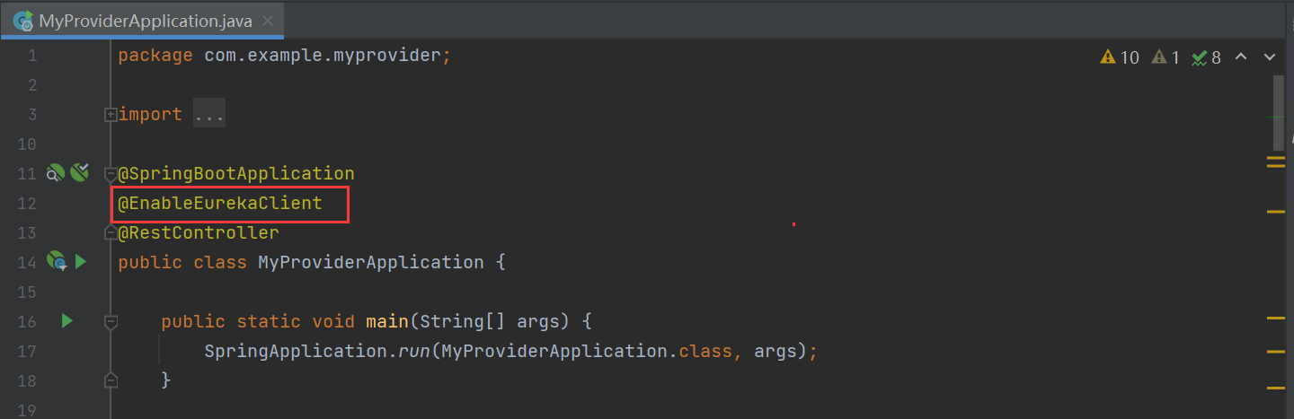Add the annotation @EnableEurekaClient to the Application to declare self as a service provider.