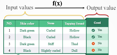 In the example of picking watermelon, the skin colour, stem shape and tapping sound are the observable information, which are the input values; the quality of watermelon is the result we hope to predict. With such a function, we can make predictions.