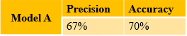For instance, the precision of model A is 67%, and the accuracy is 70%.