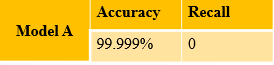 For example, although the accuracy of model B is somewhat low, the recall ratio is very high. It can identify all terrorists. However, while it is possible to misidentify a few normal people as terrorists, it is much better than missing the terrorists. Therefore, such a model makes sense.