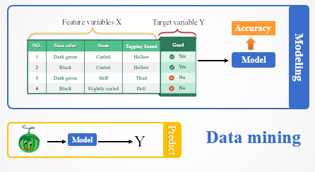 In the example of picking watermelon, the skin colour, stem shape and tapping sound are the observable information, which are the input values; the quality of watermelon is the result we hope to predict. With such a function, we can make predictions.