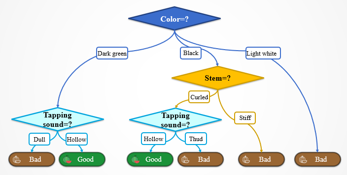Since the two sets of values in the watermelon picking example are not two sets of numerical values, the linear regression algorithm is not applicable. In this case, decision tree algorithm may be useful.