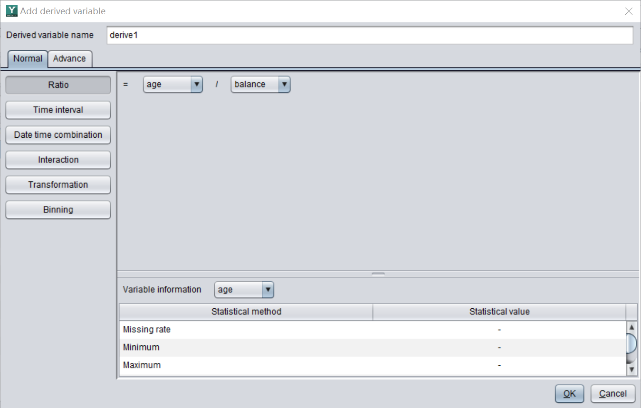 As a modeling tool, it is necessary to support users in adding derived variables. For example, YModel supports the addition of various derived variables such as ratio, interaction, binning, transformation, and date- and time-related variables.