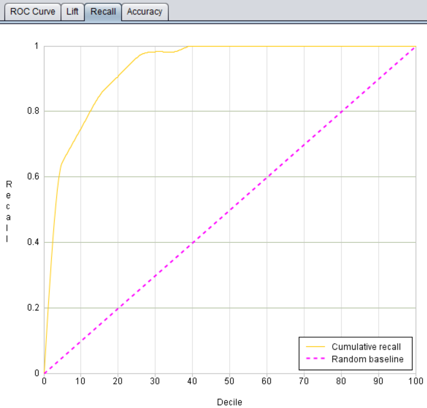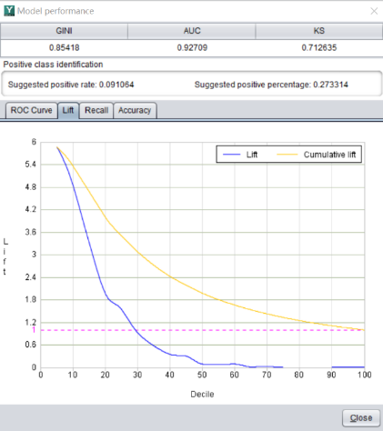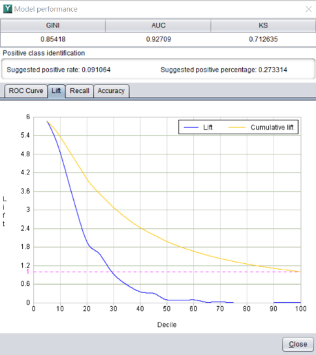 What the insurance company cares about is how to quickly identify high-risk customers from numerous policies so as to take measures to reduce claims losses. As can be seen from the recall ratio graph drawn with YModel, 75% of high-risk customers can be captured from the first 10% of the data.