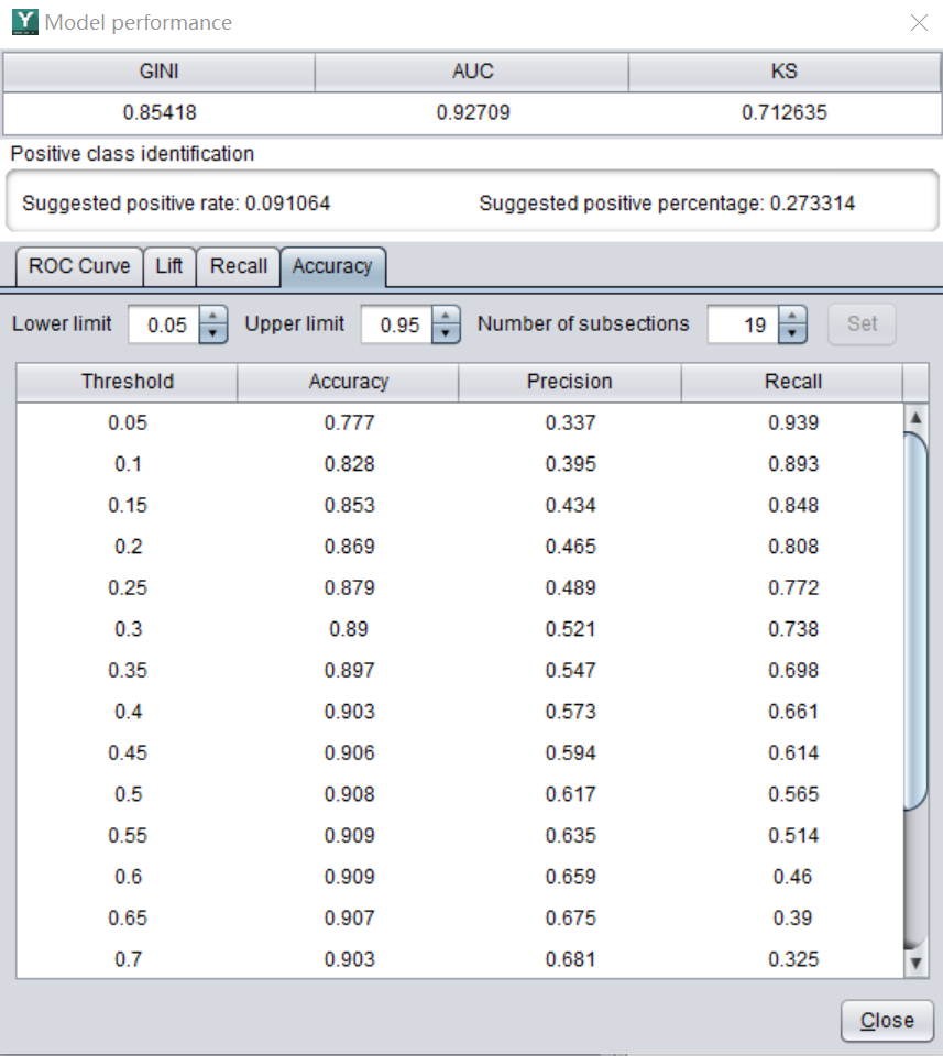However, accuracy is not the only indicator to judge whether a model is good or bad. The following figures are the interface of YModel, which can automatically calculate many indicators, such as accuracy, recall ratio and AUC.