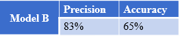 For instance, the precision of model A is 67%, and the accuracy is 70%.
