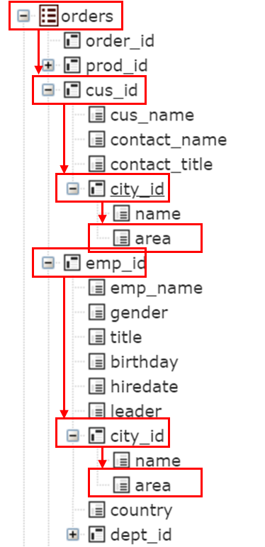 DQL does not need to join multiple tables, and querying based just on a single table (orders) works. The fields of table to which the foreign key points is used directly as attribute, and it can reference any number of levels and is easy to express. For example, if you want to query the area where a customer is located, you can write: cus_id.city_id.area. In this way, association is eliminated, multi-table association query is converted to a single table query.