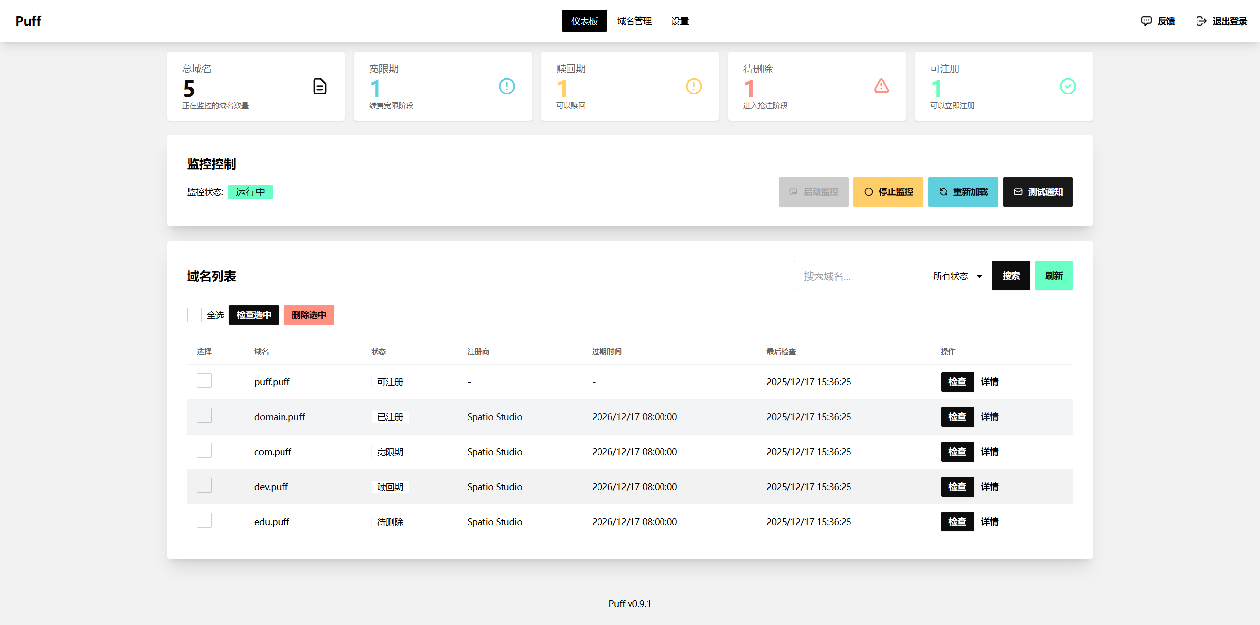 - 实时监控: 定时检查域名状态(可注册、赎回期、待删除等)