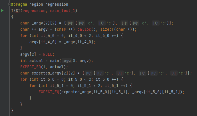 UnitTestBot C/C++ displays the test run results near the test headers. The green signs mark the passing tests, while the red ones mark the failing tests.