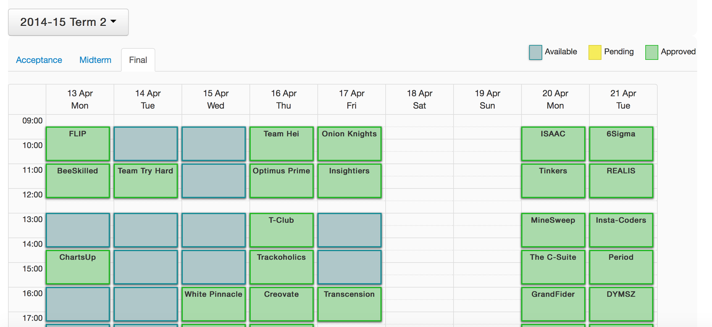 Teams need to present at different stages of their project to a panel of faculty members throughout the semester. There are a set of rules determining the faculty members required to attend these presentations. The IS480 scheduling system automates the process of determining these attendees and facilitates the process of finalising the presentation schedule.