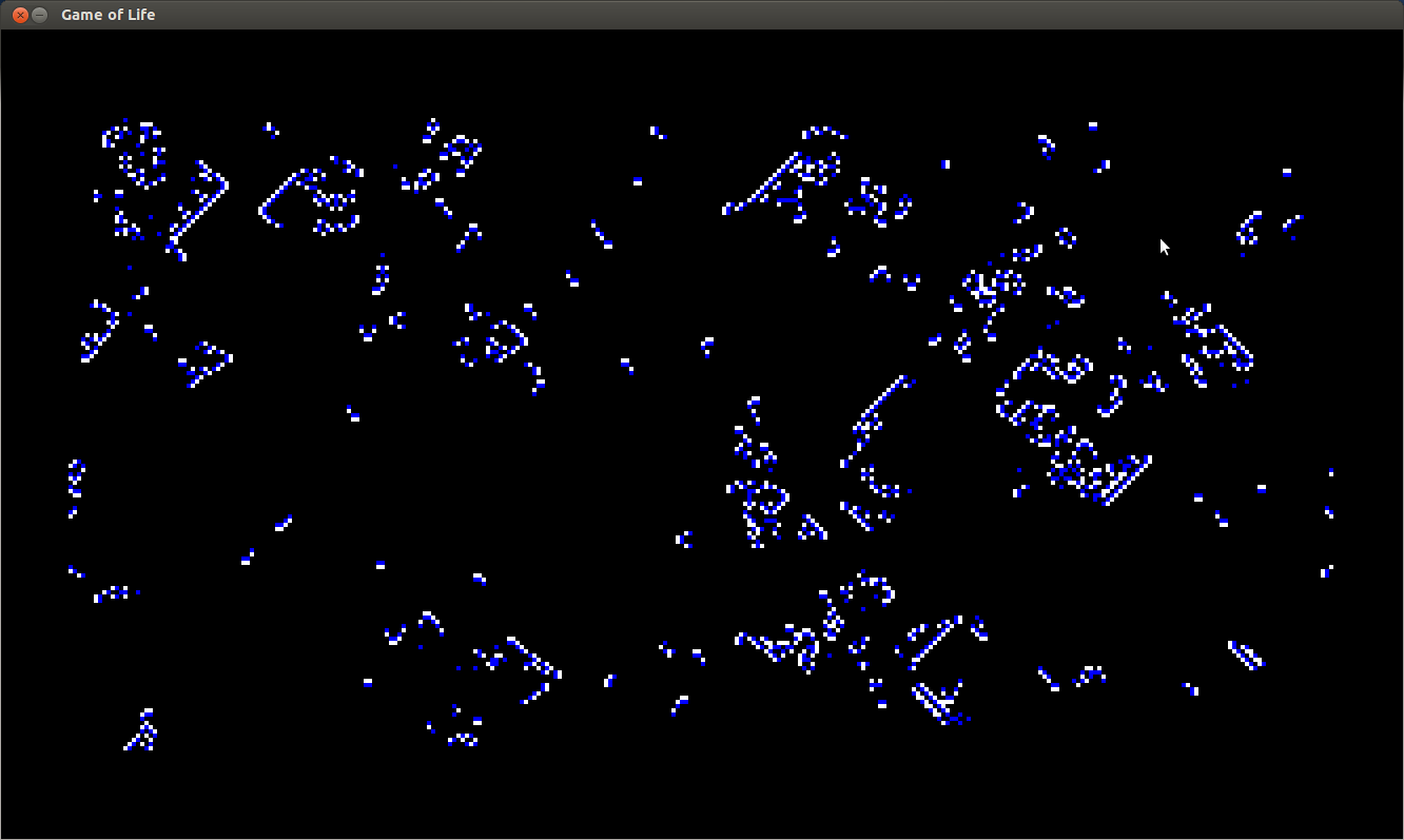The program requires one argument, which is the data file for loading the initial state (e.g. seed). Such files are provided with the repository in the /data folder. The run_life.sh shell command demonstrates running automaton with the gosper_gun data file.
