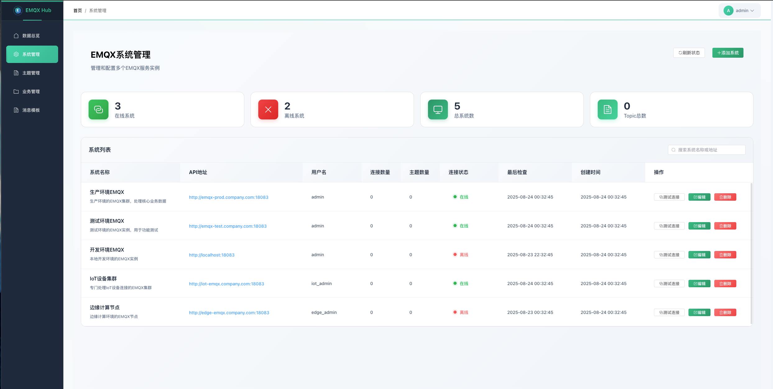 - 连接测试: 支持EMQX系统连接状态测试和响应时间监控