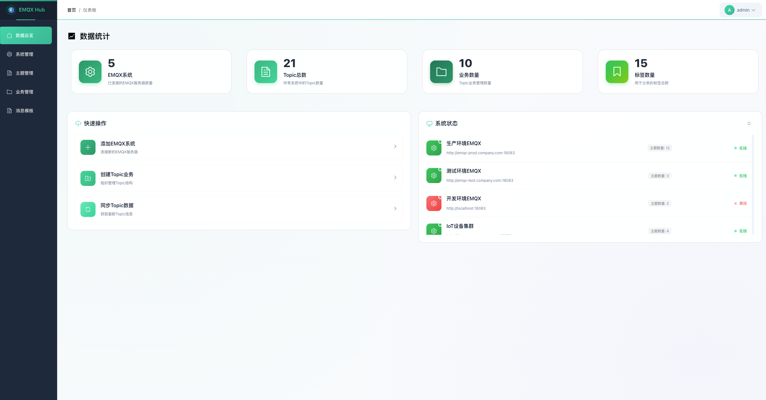 - 实时仪表板: 显示Topic总数、系统状态、连接数等实时数据