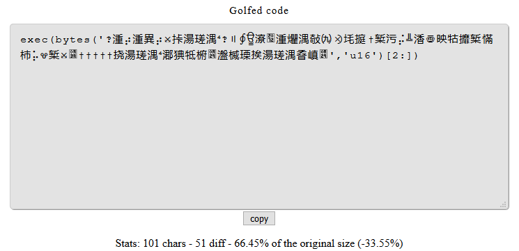 In some cases, like in Codingame's Clash of Code or code.golf for example, the goal is to make a program to solve a problem but the program needs to be the shortest possible (with the less chars if you prefer). Python is pretty efficient for this, but you can win even more chars by converting the characters of your code from utf-8 to utf-16. This is very simple to do with IDLE for instance, but this sometime takes too much time and is repetitive. This project aims to make this process faster.