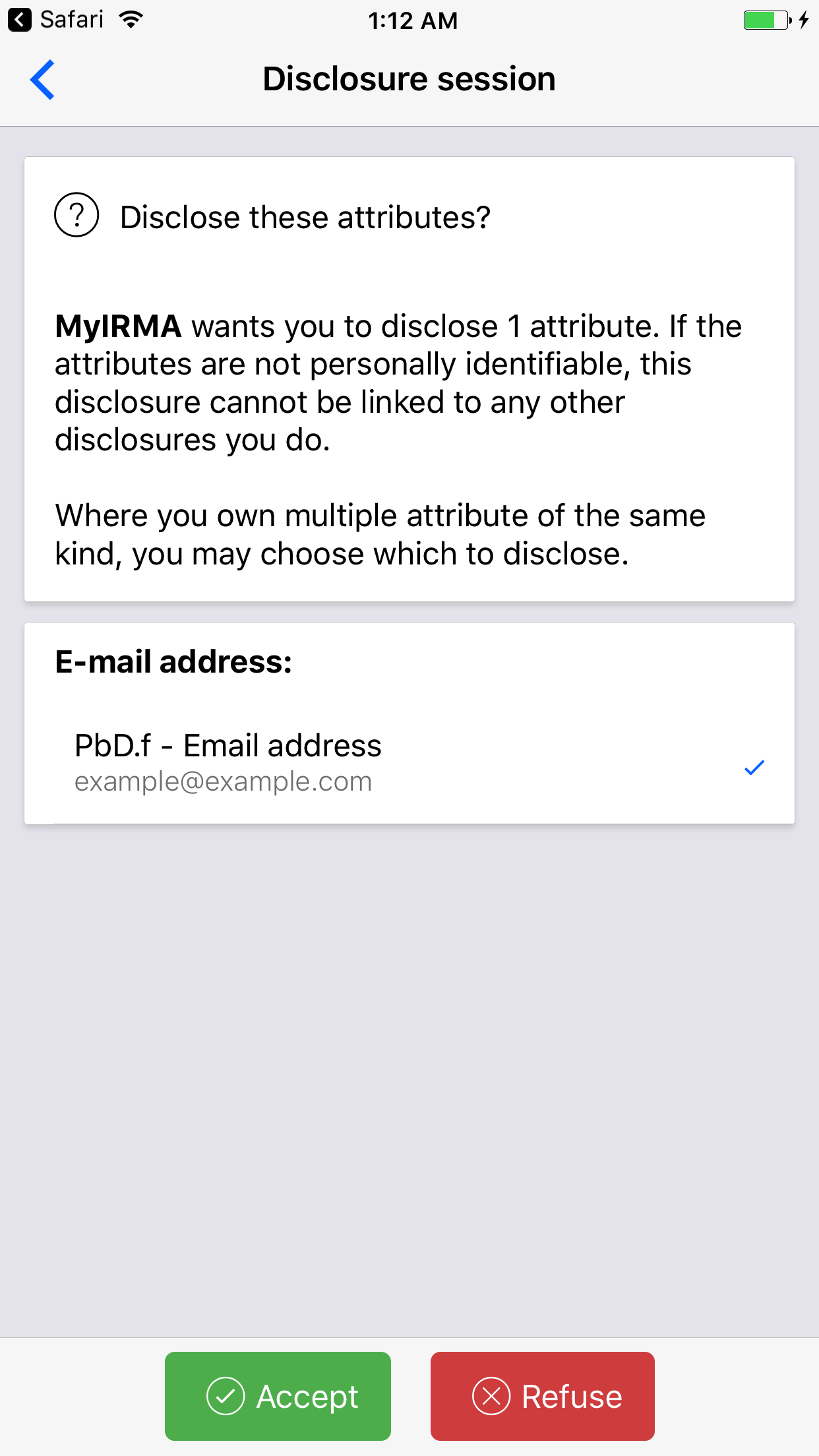 The IRMA app manages the user's IRMA attributes: receiving new attributes, selectively disclosing them to others, and attaching them to signed statements. These attributes can be relevant properties, such as: "I am over 18", "my name is ..." and "I am entitled to access ....". They are only stored on the user's device and nowhere else.