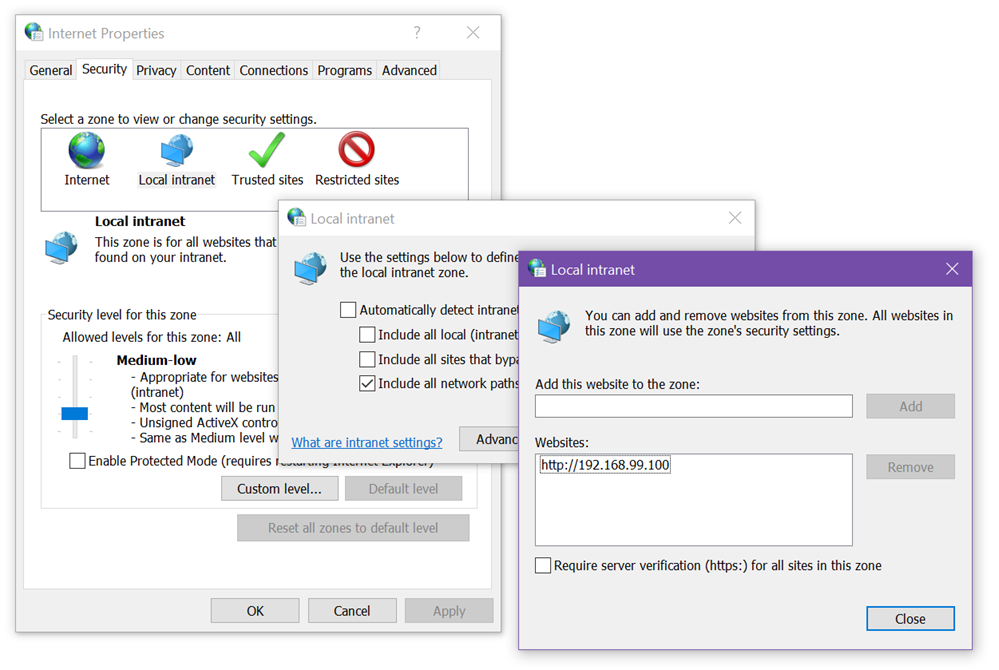 Go to Start, type "Internet Options" then then the Security Tab, then click Local Intranet, then Sites. Add your Virtual Machine's IP (in this case, the Docker Host) in that list and you're golden.