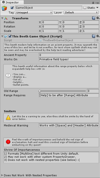 [Range(#,#)]or[RangeAttribute(#,#)]did not work with[HelpAttribute]by default and required reimplementing inside[HelpAttribute]'sPropertyDrawer. Due to this it is required that[Range]is added to an inspector property before[Help].- I also found that