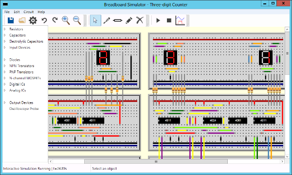This interactive circuit simulator with a breadboard style user interface was created as my A-level Computing project. It is built using a C#+WPF GUI frontend and a C++ backend. Visual Studio 2015 is required to build it, I use the free Community edition.