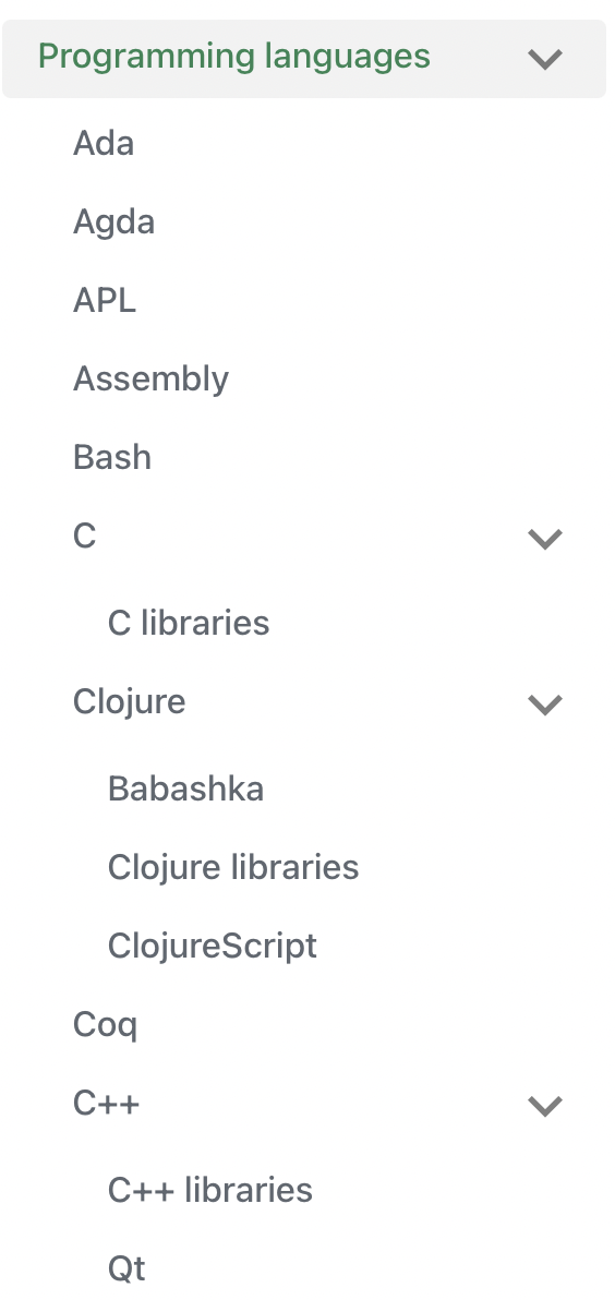The way I structure each page often looks the same and follows a structure. The sidebar you see on the left is sorted alphabetically. It's nested too. Many top level folders are nested quite deep. For example take programming languages, it's top level folder (you can see all the folders and structure of them here). All of these pages are part of programming languages: