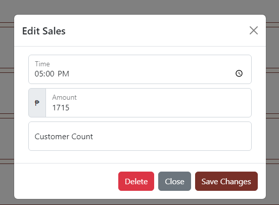 - Hover over on the sales record: "6:00 PM with amount ₱2283.00"