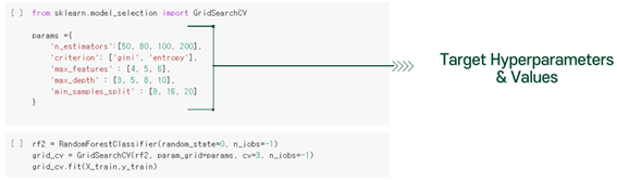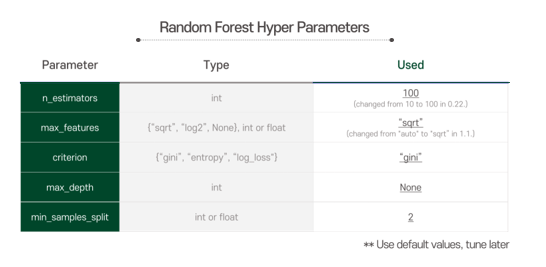 To improve our Random Forest classifier’s performance, we do hyperparameter tuning. The target parameters and values are as below.