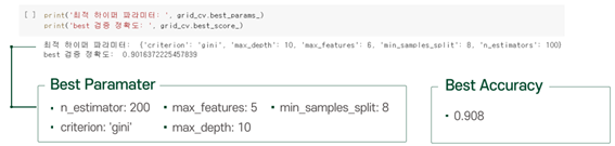 After tuning, we get best parameters and best accuracy.