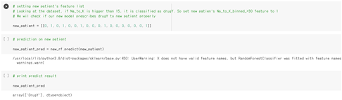 We wil check if our new model prescribes to new patient properly. Let’s set the new patient’s feature list, and predict on that data.