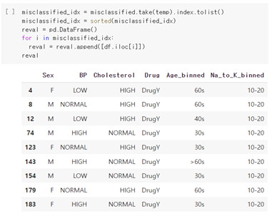 There was no significant difference between the misclassified data, and the predicted result values did not show any obvious tendencies. One notable point was that Na_to_K 10-20 took a substantial proportion. This seems to be due to the ambiguity that can be classified into all drug types if they belong to this group. Also, people who should have been prescribed DrugY were likely to be misclassified, which is suspected to be due to the universal range of data. Therefore, the cause of the misclassified data is thought to be the ambiguity of classifying boundary values.