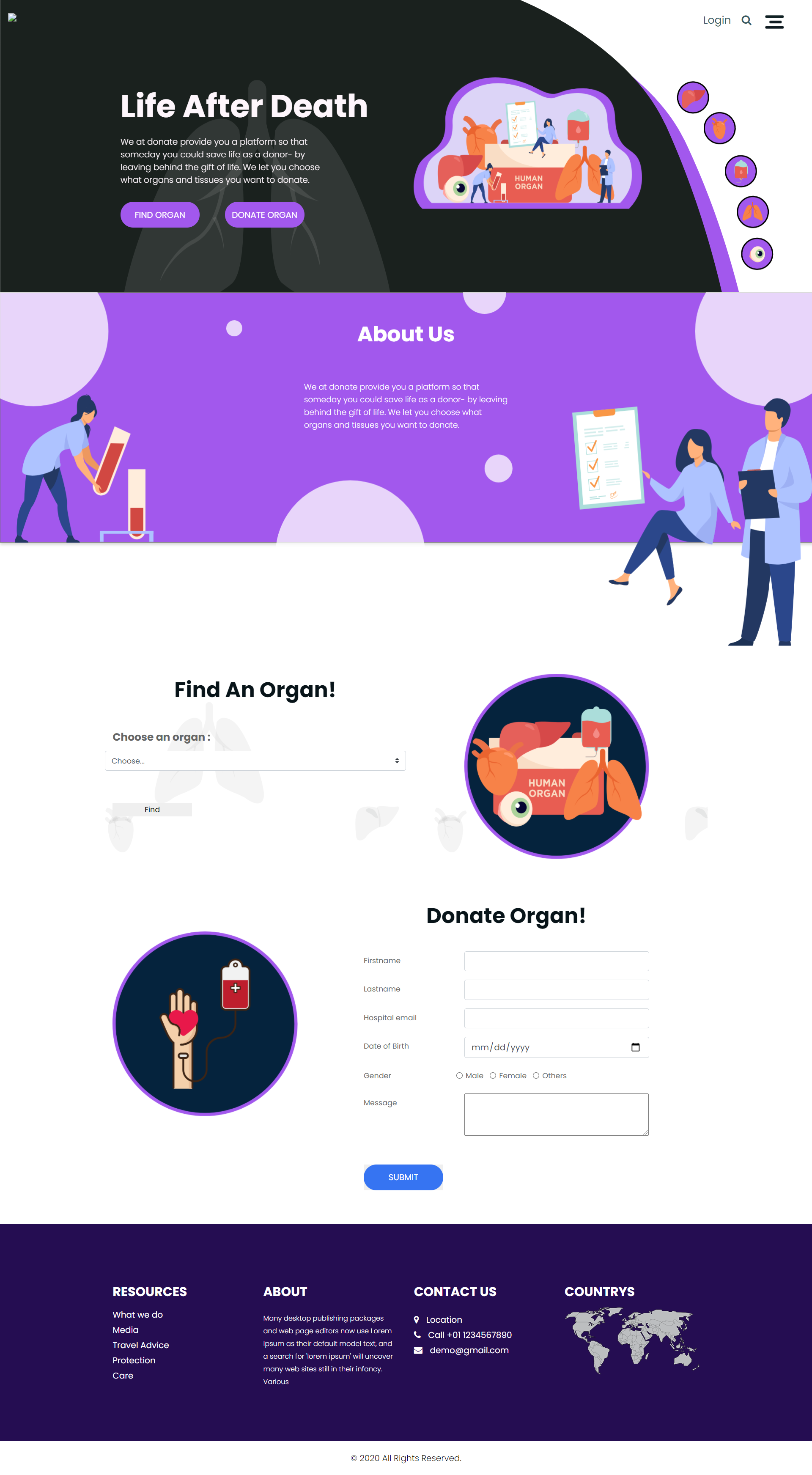 Our project is a fullscale web application that is responsible for letting a hospital admin to add or delete organs(kidney, lungs, pancreas) to the database once an organ is donated or taken from a particular hospital. Our solution also includes Plasma during the COVID situations. Our application also allows a normal user interaction apart from the hospital admin. A normal user can send a message in the app if he wishes to donate organs/plasma. That message is directlty sent to the Hospital email through an API. Our user can also search for organs that he needs urgently. Once the user selects the particular organ that he needs, a thorough search is made in the database and if that particular organ is present in out database, then the name of the Hospital along with all the details of that organ(age of the person who donated, sex of the person who donated etc) is displayed.