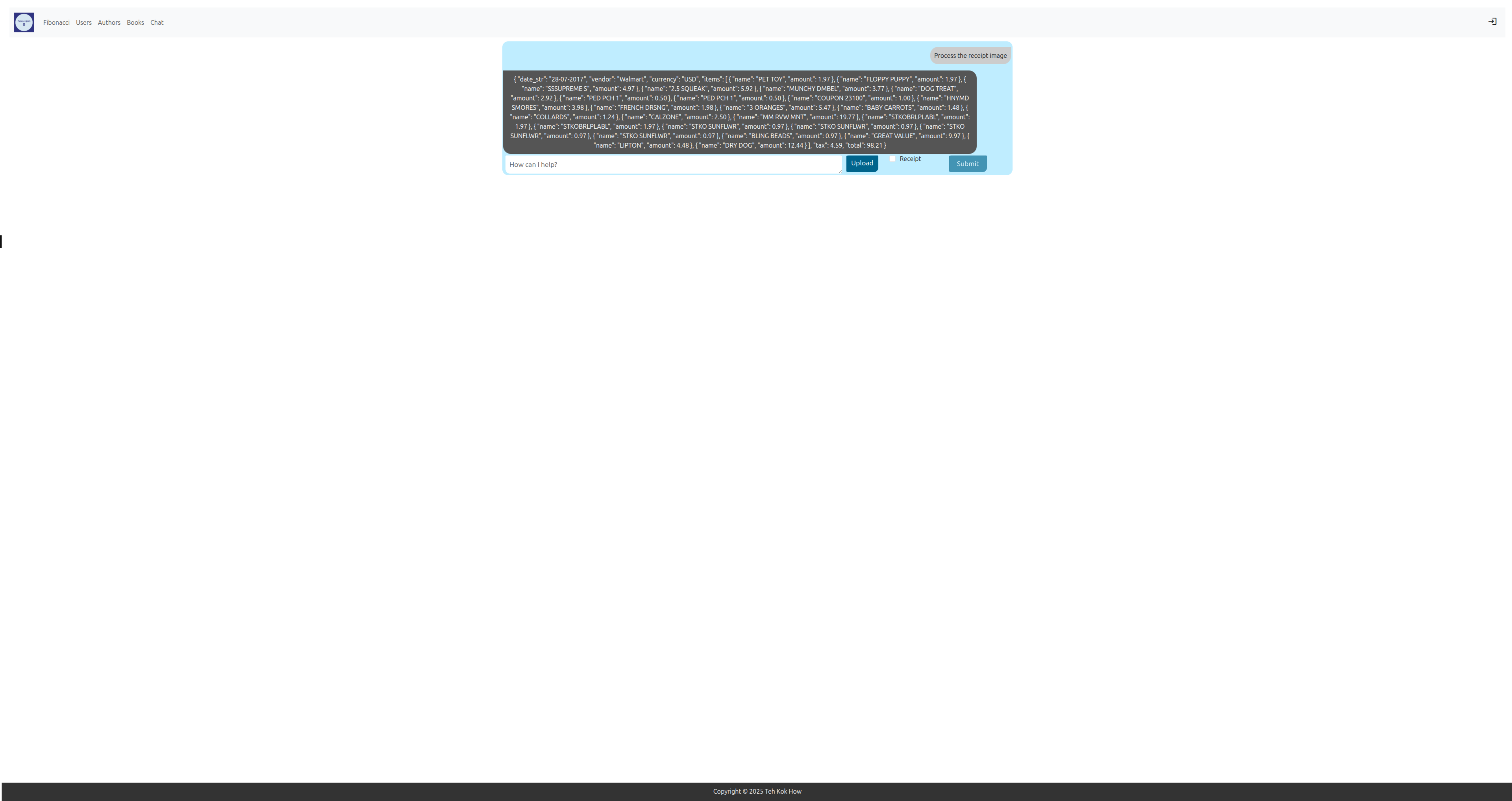 - Upload an image, "receipt" in this case, and it wil return a structured data containing details in the receipt:
