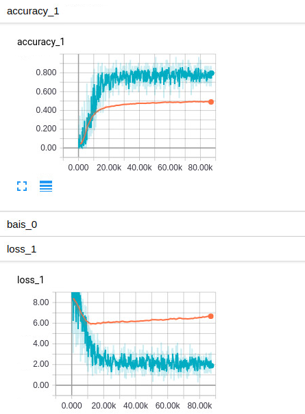 但是,仍然存在一个问题就是测试集效果依然不好,准确度只有40%多。于是我加了dropout功能,在dropout之分别取0.5和0.8的时候结果如下图所示: