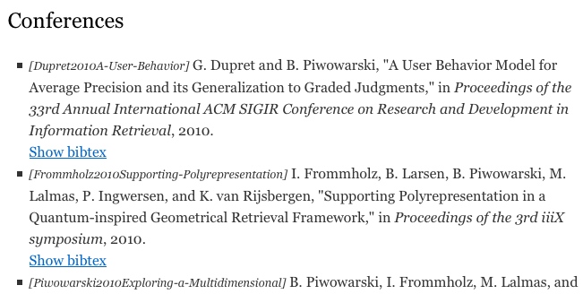 Papercite format bibtex entries as HTML so they can be inserted in WordPress pages and posts. The input data is a bibtex file (either local or remote) and entries can be formatted by default using various predefined styles. Bibtex source file and a link to the publication are also available from the HTML.