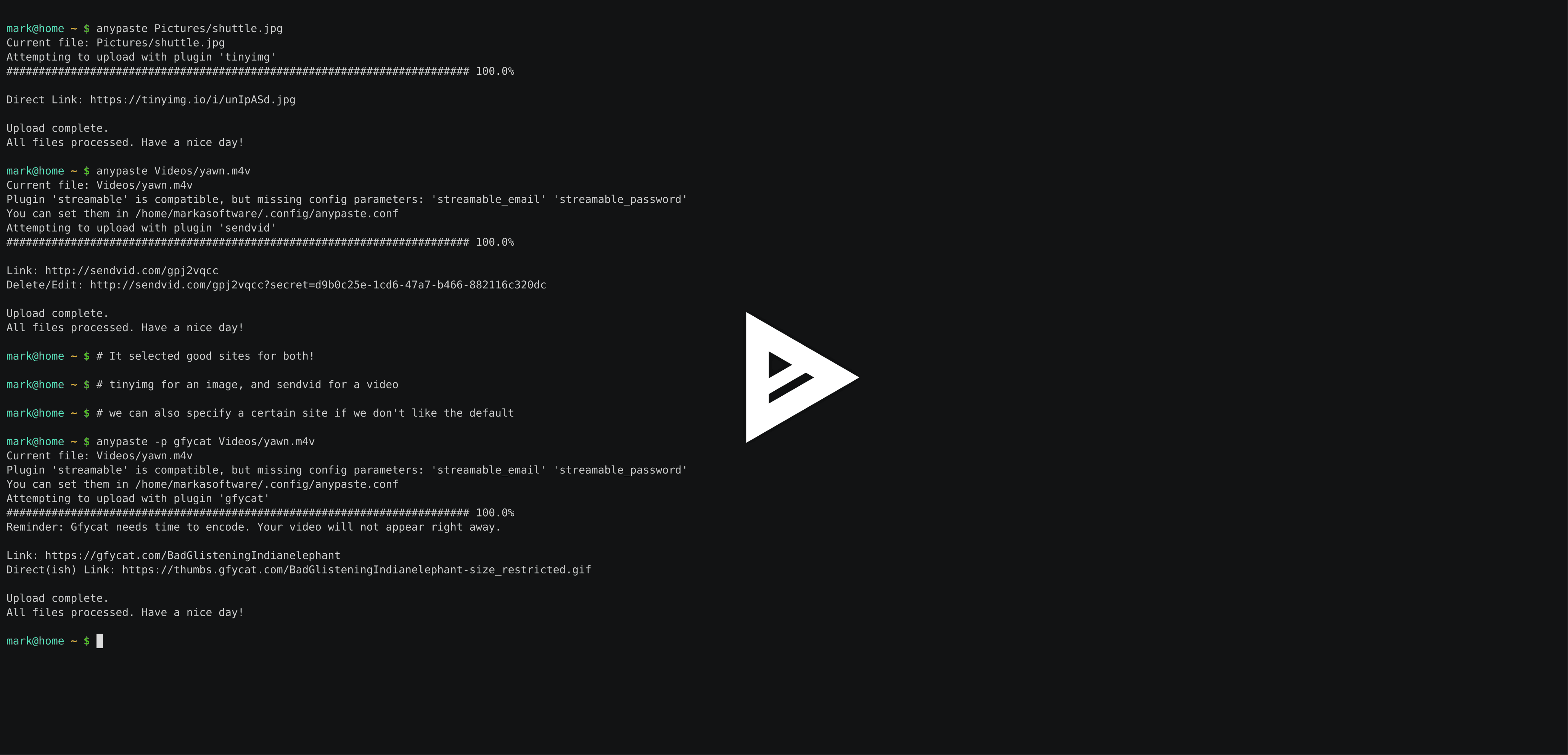 anypaste file.jpg: Uploadfile.jpg, automatically selecting the plugin (standard usage).anypaste file.jpg file.m4v: Upload multiple files, with automatic plugin selection for both.anypaste -p gfycat file.m4v: Uploadfile.m4v; use a plugin containinggfycatin its name (manual plugin selection).anypaste -l: List all plugins/sites.anypaste -l file.m4v: List all plugins/sites compatible withfile.m4v.anypaste -t private launch-codes.txt: Uploadlaunch-codes.txtto a "private" site (URLs are not publicly listed).anypaste -f -p gfycat something.tar.gz: Uploadsomething.tar.gzwithgfycat, even thoughgfycatis not compatible (override compatibility checks).anypaste some-directory: Uploadsome-directory, a compressed tarball will automatically be created (.tar.gz)