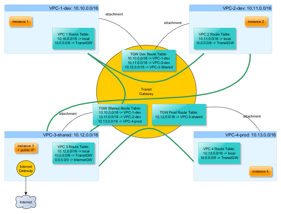 A Transit Gateway relies on Route Tables. By default, a new Route Table is created in the Transit Gateway, which populates with the routing info toward every VPC attached to the gateway (the full mesh scenario) The Terraform code in this project demonstrates a more complex scenario in which traffic is isolated based on the environment. Four VPCs are created, with two subnets each (in separate AZs):