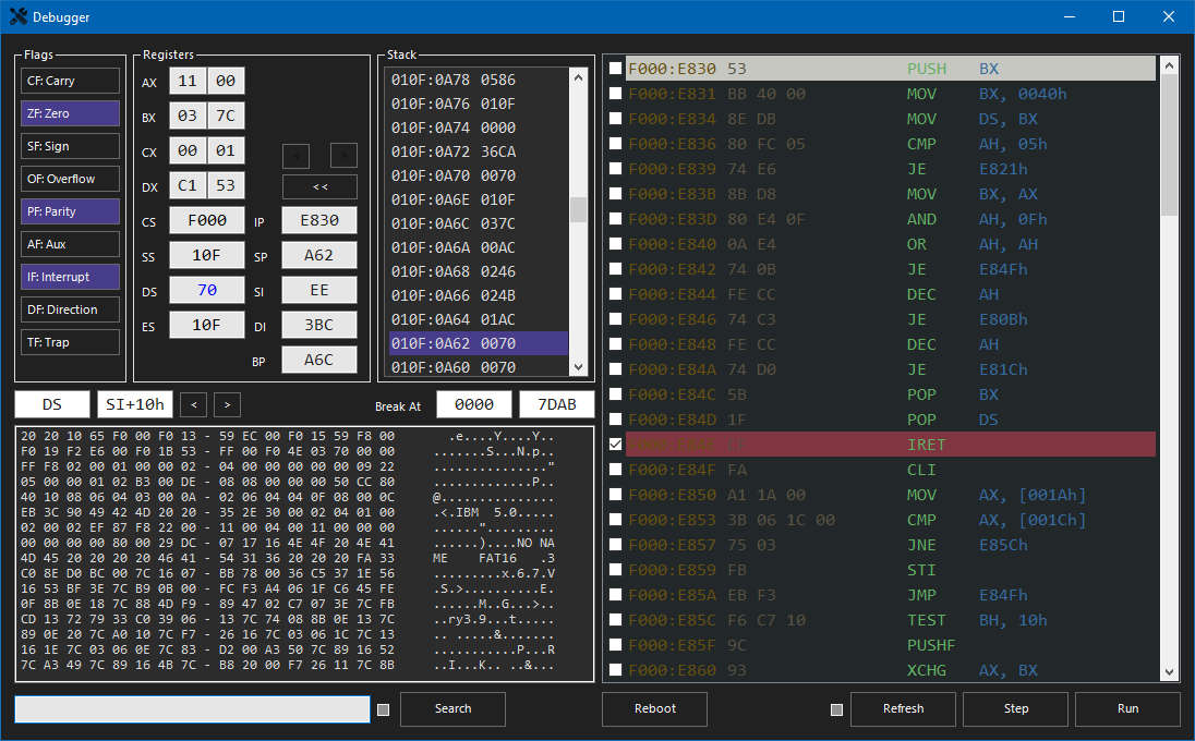 - Full 8086 architecture emulation: CPU, Memory, Flags, Registers, and Stack