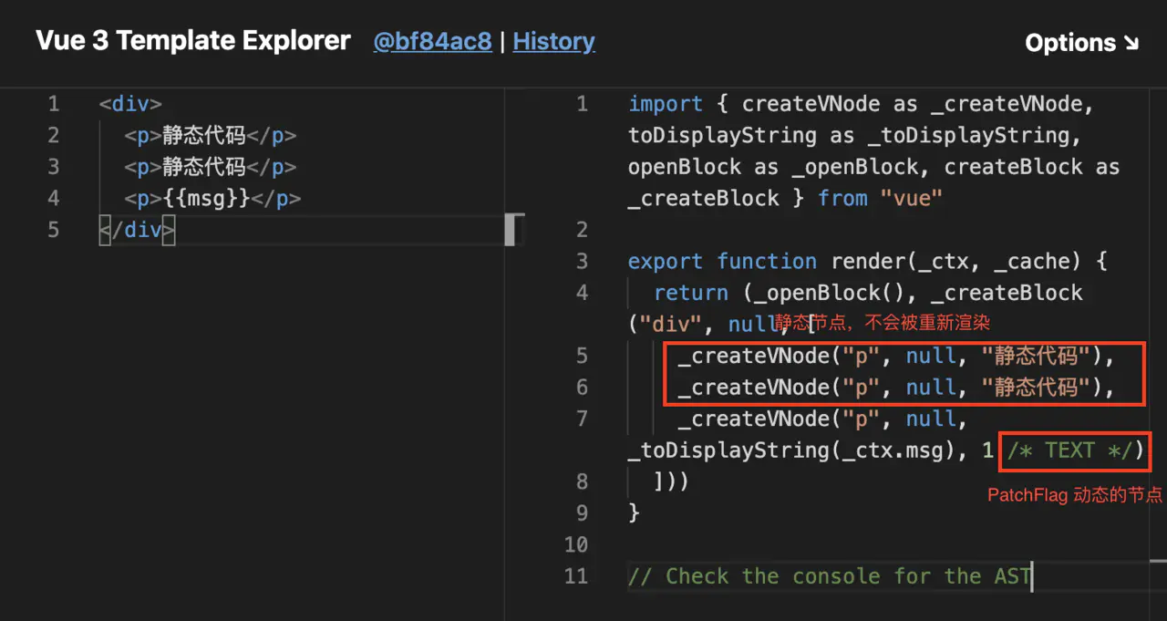在这个模版编译时,编译器会在动态标签末尾加上 /* Text*/ PatchFlag