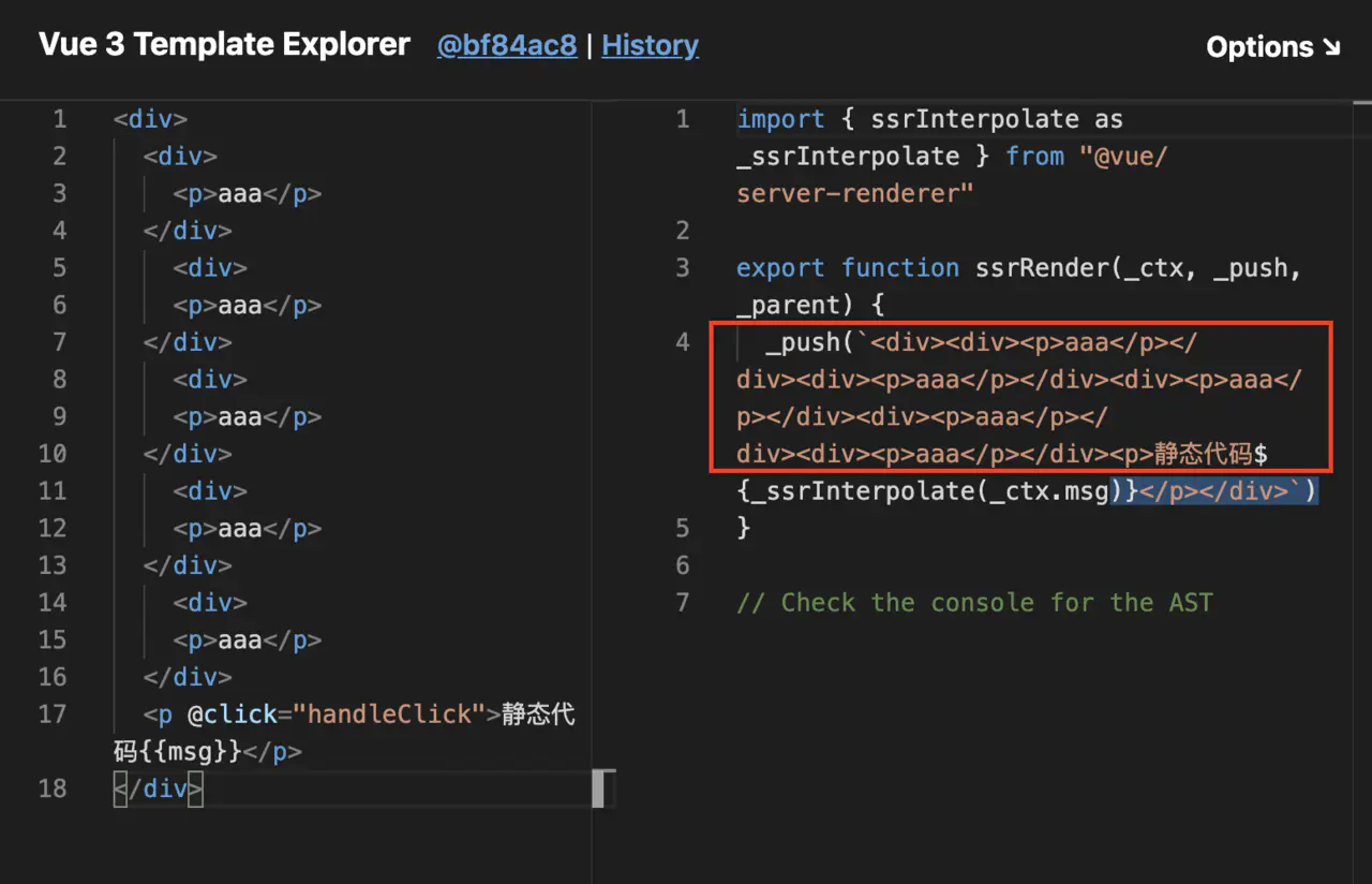 在客户端,当静态节点嵌套足够多的时候,VUE编译器也会将VDOM转化为纯字符串的HTML