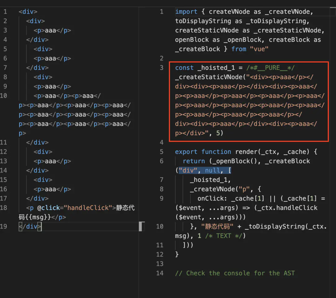 _createVNode("p", { onClick: _ctx.handleClick }, "静态代码", 8 /* PROPS */, ["onClick"])