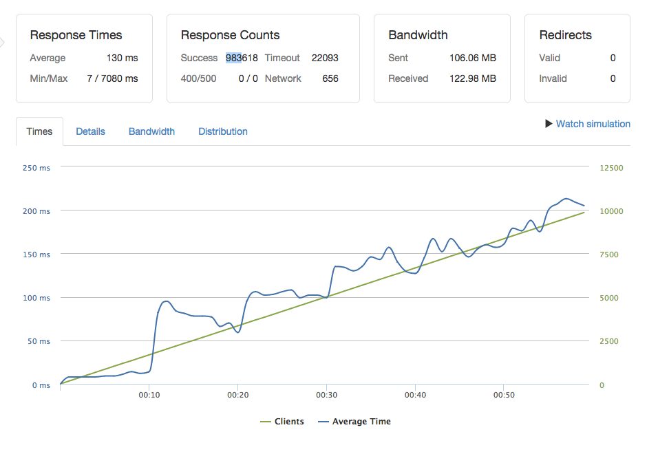 Tested to handle 15,000 requests persecond on modest hardware with an adverage response time of 130ms.