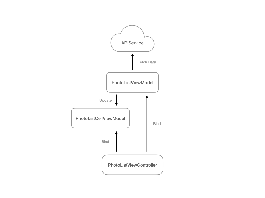 }View에서 ViewModel의 바인딩 Closure들을 구현해줌으로써 View의 갱신에 대한 코드를 정의해주고 값의 변화에 따른 뷰 갱신을 호출하는 행위는 ViewModel에 위치하게 됩니다. 즉 데이터에 따라 뷰의 갱신을 명령하는 행위는 ViewModel에서 이루어지게 됩니다.