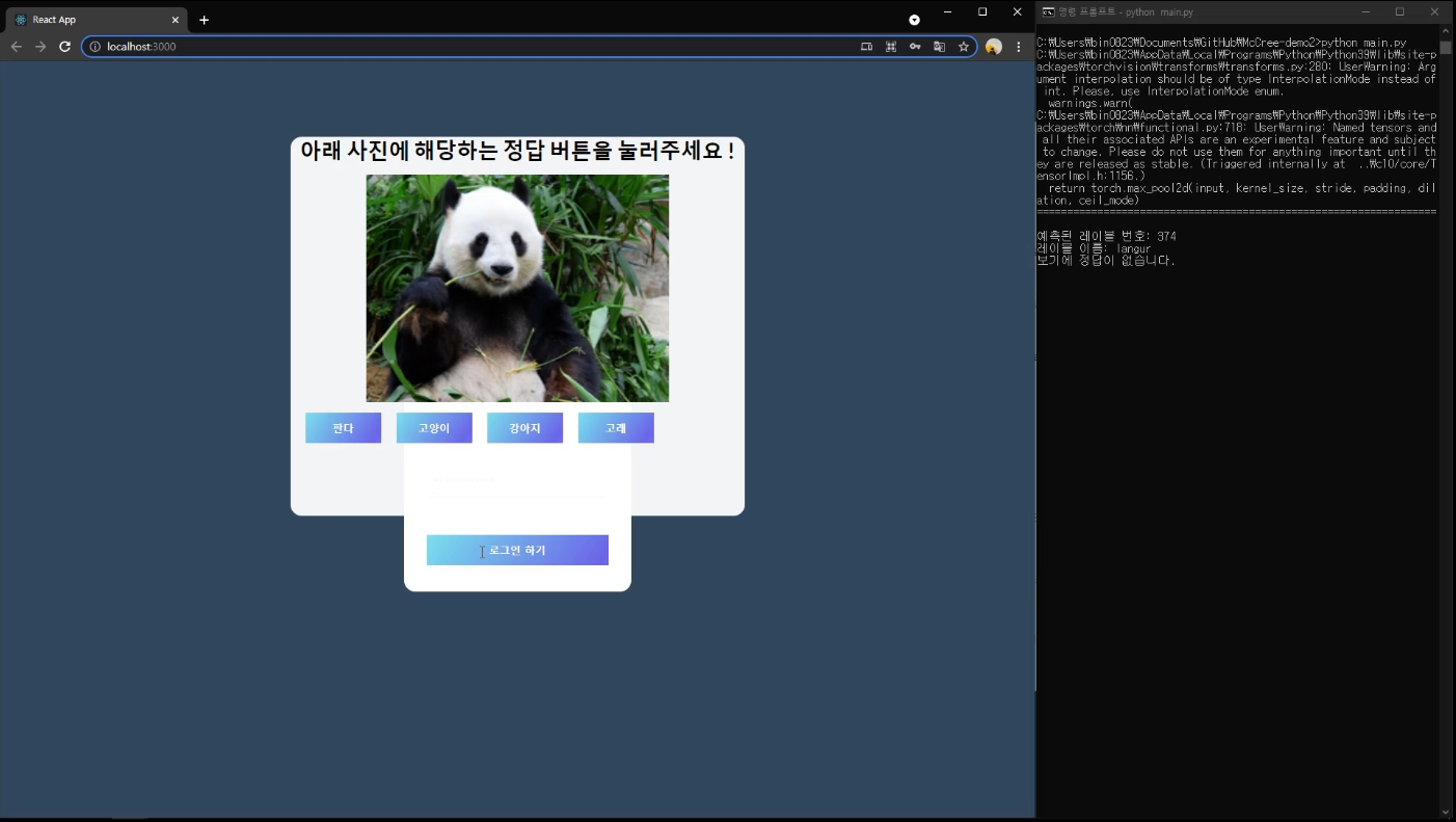 - adversarial noise가 적용되지 않은 이미지를 사용하여 매크로 차단을 시도했을 때는 resnet-101이 판다 사진을 정확이 분류해내 로그인에 성공하는 것을 볼 수 있습니다.