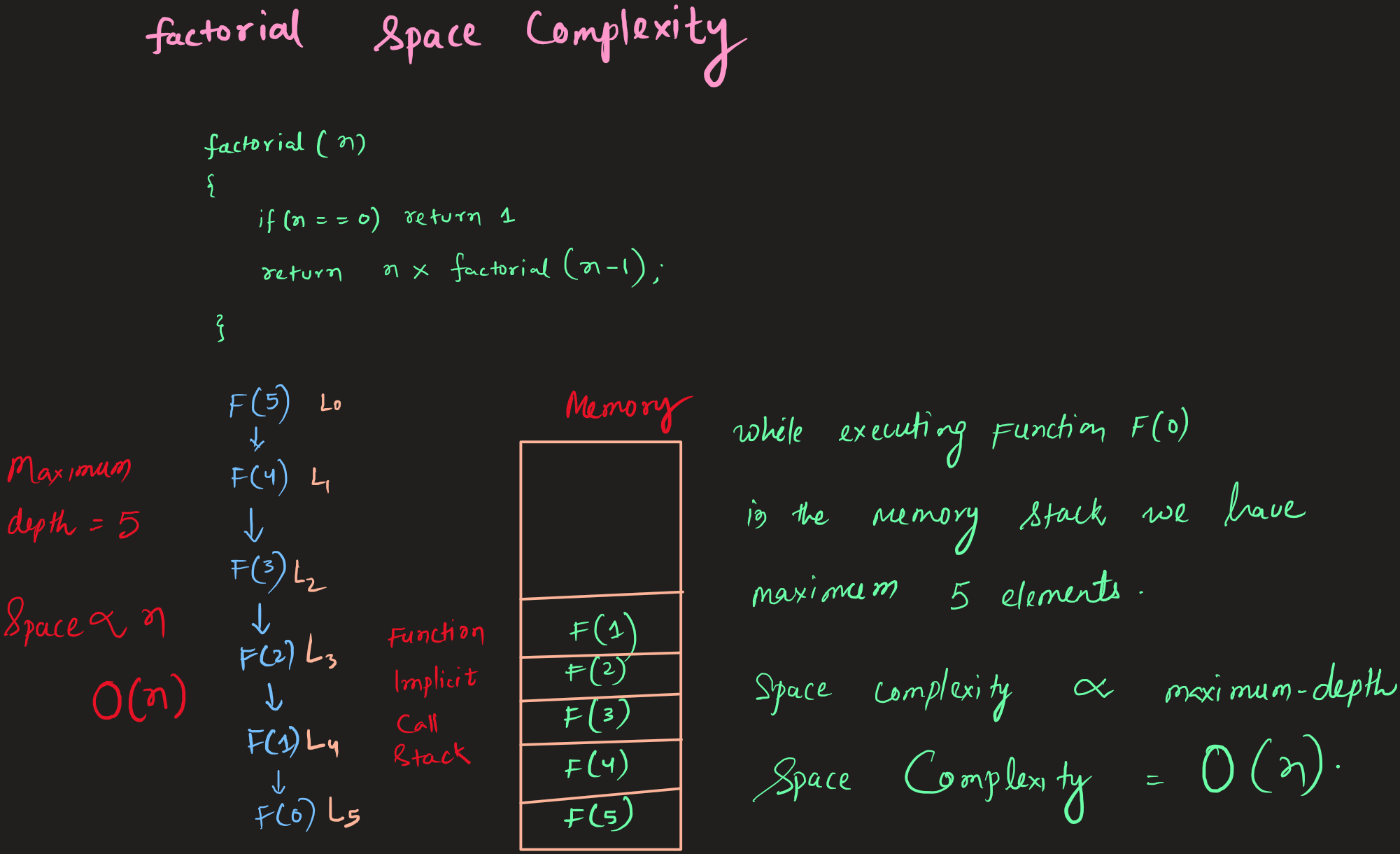 Recursive functions take extra on the stack therefore, memory complexity is lograrithmic O(logn)