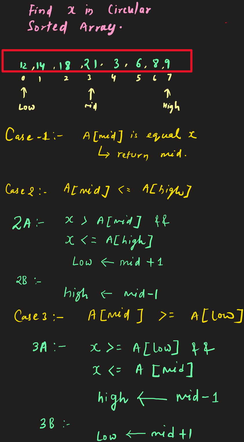 Circularly sorted array means a rotated sorted array. Find index of 8 in [12, 14, 18, 21, 3, 6, 8, 9] array.