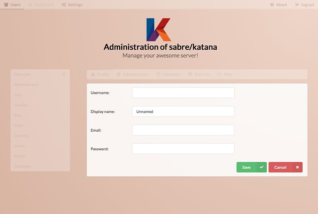 sabre/katana is a contact, calendar, task list and file server. Based on standards used worldwide (respectively CardDAV, CalDAV and WebDAV), sabre/katana will sync your data between any devices, from everywhere, every time. It lets you manage users and their data in a minute. sabre/katana is powered by sabre/dav, an open source technology trusted by the likes of Atmail, Box, fruux and ownCloud.