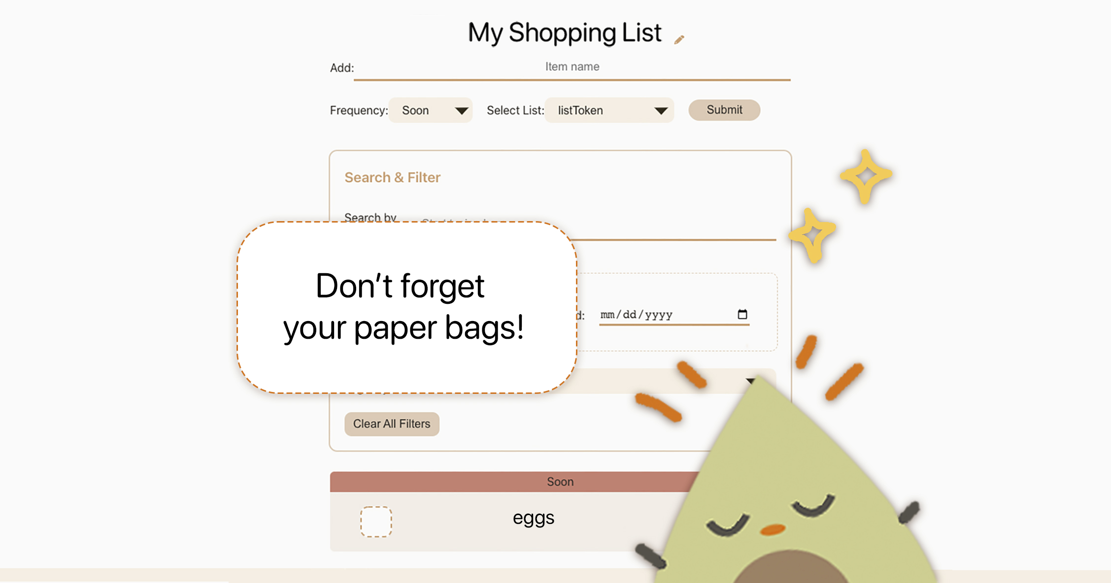 As a user, you will enter items (e.g., “Greek yogurt” or “Paper towels”) into your list. Each time you buy the item, you mark it as purchased in the list. Over time, the app comes to understand the intervals at which you buy different items. If an item is likely to be due to be bought soon, it rises to the top of the shopping list.