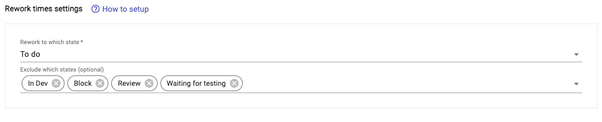 In Rework times settings, it contains Rework to which state Input and Exclude which states(optional) Input. The options in the Rework to which state Input are all from Board mappings, the options are ordered, and when an option is selected, the rework information of the option and all subsequent options will be counted in the report page and export file. The Exclude which states(optional) Input can help you exclude certain subsequent options (image 3-7).