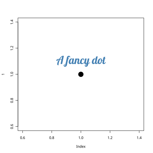 text(1, 1.1, "A fancy dot", family = "lobster", col = "steelblue", cex = 3)