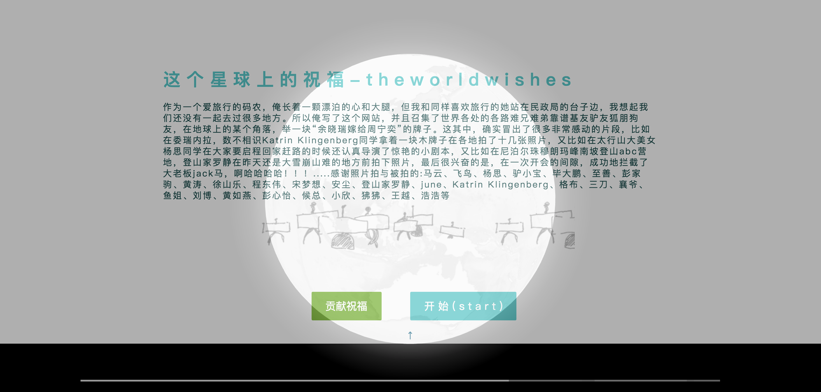 Open Wedding(链接) openwedding.org 简单、开源、易用的结婚视频生成模版 文件夹->交互版结婚创意网页 将制作求婚、婚礼所用的视频,改成html5交互版,内容和功能不断更新 项目1:地球上的祝福(请用chrome/firefox访问) 曾喜欢浪迹天涯的旅行,但当我和mm站在民政局的桌子前的时候,我们还没有一起去过很多地方。 于是我找到了世界各地的各种好基友/网友拍了一组求婚的照片,做了这个html5网页动画。 技术和使用 手绘+webGL+css+canvas 1、手绘板在adobe illustrator中用铅笔工具绘制手绘贴图(双击铅笔工具按钮可以进行设置) 2、用ai插件drawscript将ai文件转化成记录点信息的json文件 3、js的3d库three .js制作地球,以动态贴图的方式将canvas贴在表面 4、记录7大洲的中心位置经纬度、写视角切换程序 5、把文件按照类似../data/3worldwishes/5Asian/10Nepal/image/2.jpg 的顺序把要展示的图片放在文件夹里 6、 进入bin文件夹,运行node.js程序app.js 根据文件夹目录生成url的列表 待开发:播放器组件、视频播放、全屏切换 如果您能帮助我们拍摄照片,不胜感谢,请发至 [email protected] 感谢 阿里巴巴给我熟悉这些前端技术的机会 大隐提供的服务器 技术指导剪巽、 大隐 各种兄弟姐妹基友网友狐朋狗友在天涯海角世界各地拍摄的牛逼哄哄的照片! 照片拍摄者:飞鸟、杨思、登山家罗静、june、格布、三刀、襄爷、鱼姐、刘博等 and 父母 老婆作为压轴!!